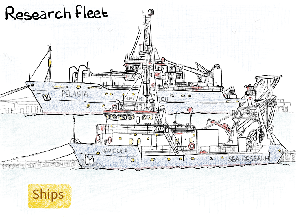 RV Navicula is 26 meters long and is especially designed for research in the Wadden Sea. The ship’s limited draft makes it particularly suitable for work in shallow channels and on the tidal flats. The ship provides a dry and a wet lab and has space on deck for a laboratory container. The A-frame on the aft side and the winches may be used for sampling and measuring. Besides the three crew, the Navicula offers space for up to eight passengers.